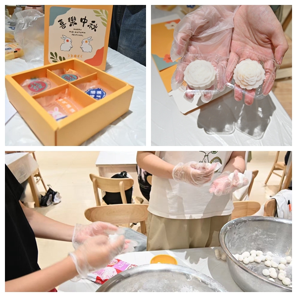 在冰皮月饼制作环节,同学们自由组队,在饮食管理服务中心工作人员的指导下,大家纷纷化身“糕点师”,亲自体验从称重、揉皮、包馅到压模成型的完整制作过程。整个制作区气氛热烈,欢声笑语此起彼伏,一个个印有“如意”“团圆”等吉祥图案、造型精致的冰皮月饼便跃然眼前,同学们互相展示、分享自己的劳动成果。大家纷纷表示,通过亲手制作月饼,不仅感受到了中秋的节日氛围,更在动手实践中感受到了中华传统饮食文化的深厚底蕴与独特魅力。