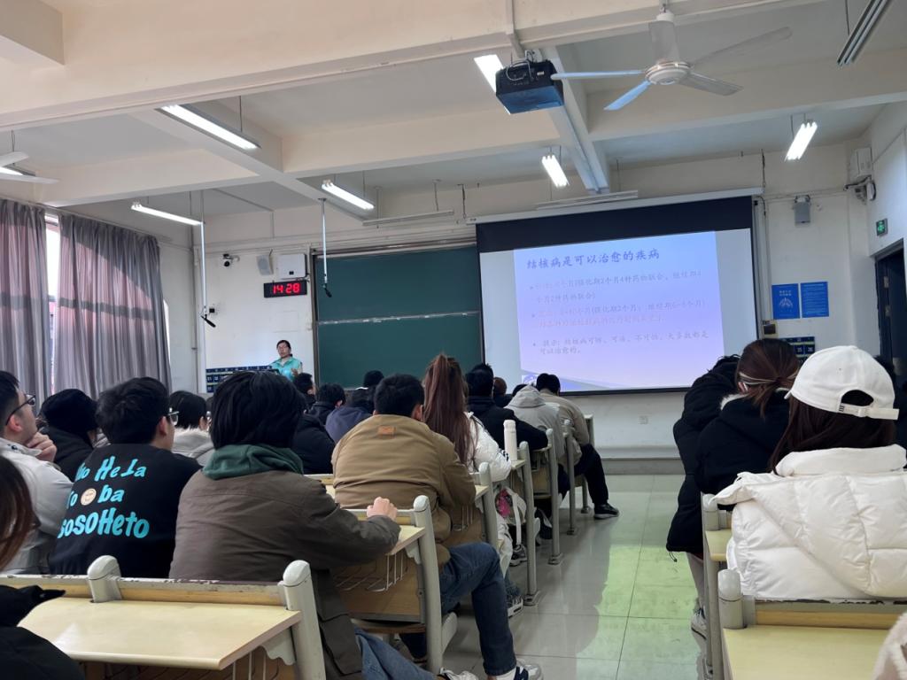 讲座中,主讲人西海岸新区结核病防治所公卫科主任徐燕以《结核病基础知识和潜伏感染预防治疗》为主题,结合丰富的临床实践经验,系统讲解了结核病的流行现状、传播途径、常见症状、预防措施、规范治疗及潜伏感染防治等核心知识,积极引导同学们牢固树立“自身健康第一责任人”的理念,切实加强个人防护,将理论知识转化为日常学习生活中的自觉行动,共同构筑起坚实的校园结核病科学防线。